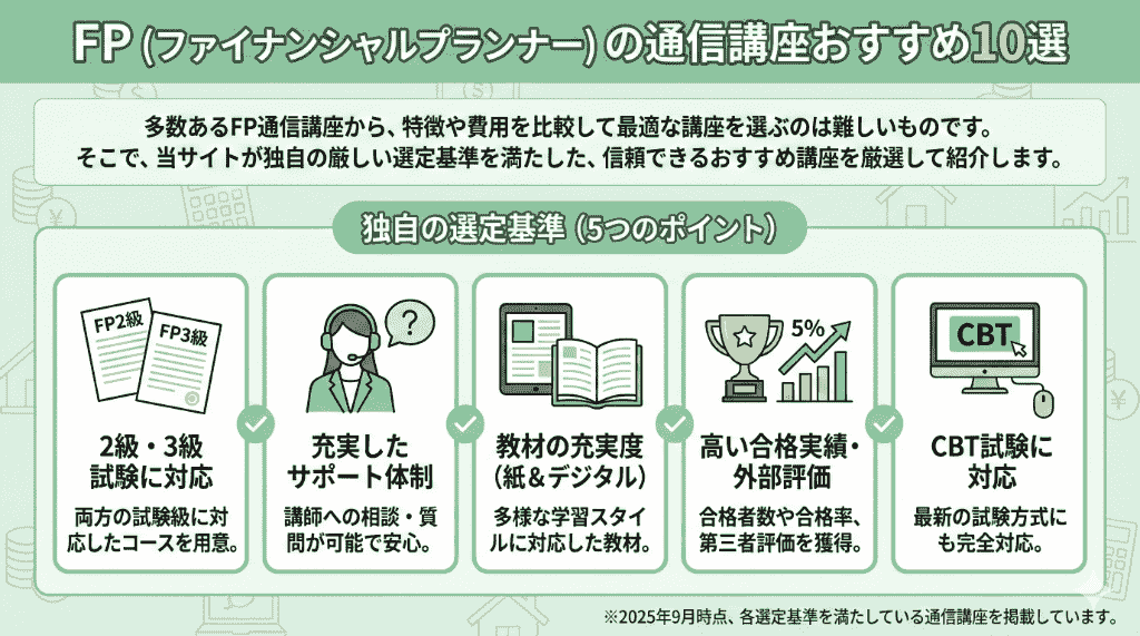 当サイトでは独自の選定基準を設け、その基準を満たした通信講座を紹介しています。当サイトがおすすめするFP2級・3級の通信講座を一覧でまとめましたので参考にしてみてください。