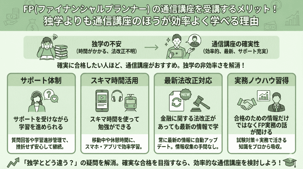 - 2 FP(ファイナンシャルプランナー)の通信講座を受講するメリット!独学よりも通信講座のほうが効率よく学べる理由