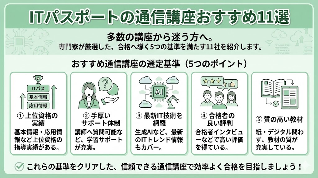 そこで当記事では独自の選定基準を設け、その基準を満たした11社の通信講座を厳選しました。以下では、それぞれの通信講座の特徴、通信講座でITパスポートを学習するメリット、ITパスポートの合格者が解説する学習のコツなどを紹介します。