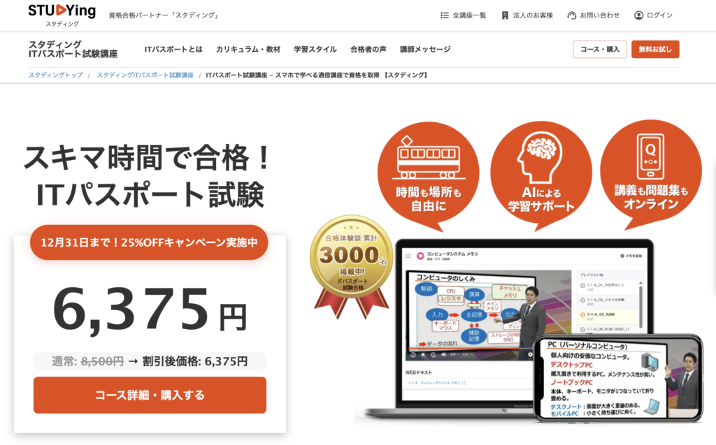 ひたすら四肢択一問題を解いていくITパスポートの学習は、タップ・クリックだけで回答できるスマートフォン学習と非常に相性がよいです。「どの通信講座を選べばよいのかわからない」という方は、コストパフォーマンスに優れたスタディングの利用を検討してみてください。