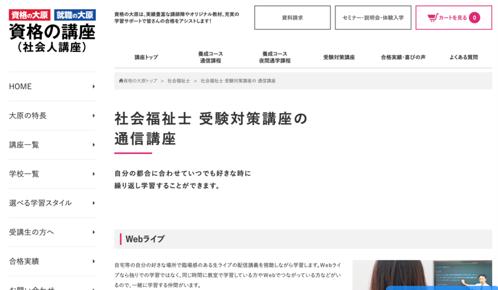資格の大原は、動画講義を中心に理解を深めていきたい人に向いた講座です。試験範囲を順番に学べるため、科目の多い社会福祉士試験でも整理しながら進めやすい点が特徴です。