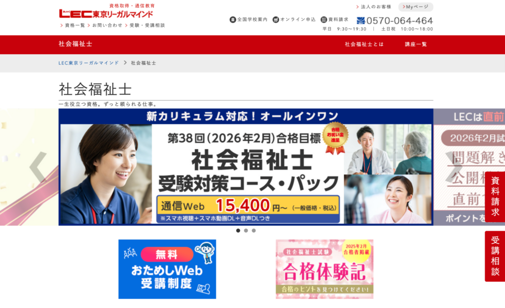 LECは法律系の資格に強いスクールで、社会福祉士試験でも法制度を中心に整理したい人に向いています。制度の背景や法律同士の関係を説明する講義が多いため、条文の理解に時間がかかる人でも理解が進みやすい内容です。