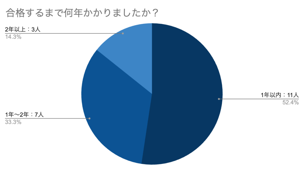 合格者21名に学習開始から合格までの期間を聞いたところ、「1年以内」が最も多いという結果になりました。とはいえ、仕事や家庭の事情で学習が中断し、2年以上かかった人も一定数います。