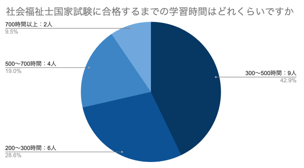 実際に社会福祉士国家試験に合格した人に、「合格するまでの学習時間はどれくらいですか?」とアンケートをとったところ、下記の結果になりました。