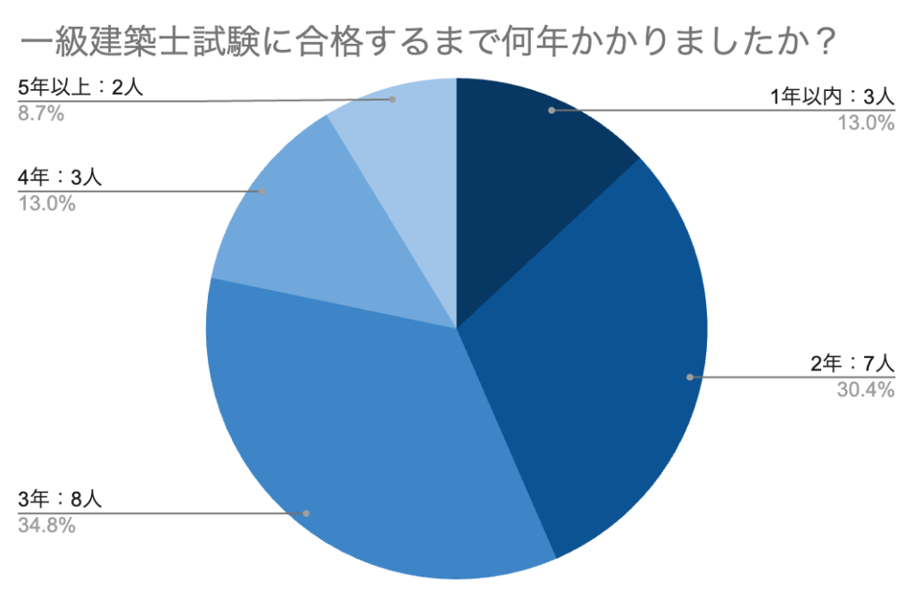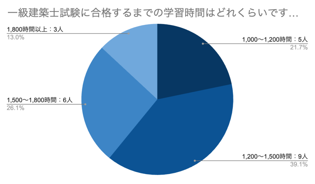 実際に一級建築士試験に合格した人に、「一級建築士試験に合格するまでの学習時間はどれくらいですか?」とアンケートをとったところ、下記の結果になりました。