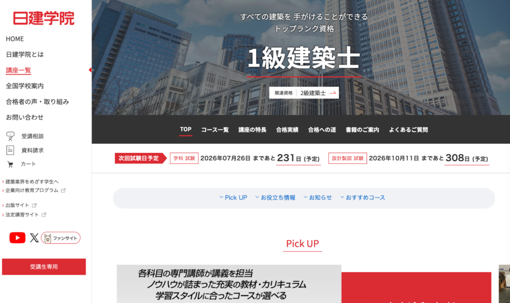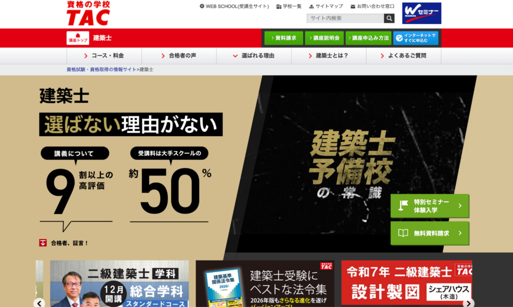 資格の学校TACは大手資格予備校として知られており、一級建築士向け講座でも学科・製図の両方について体系的なカリキュラムが紹介されています。