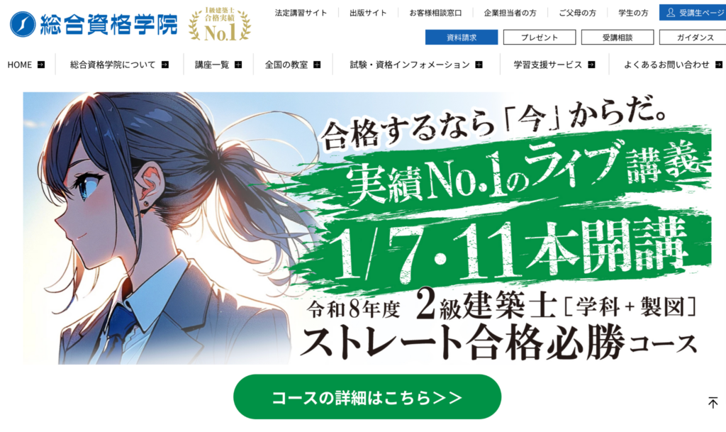 | 総合資格学院 | 教材・講義内容・合格者の声が豊富に紹介され学習過程をイメージしやすい |