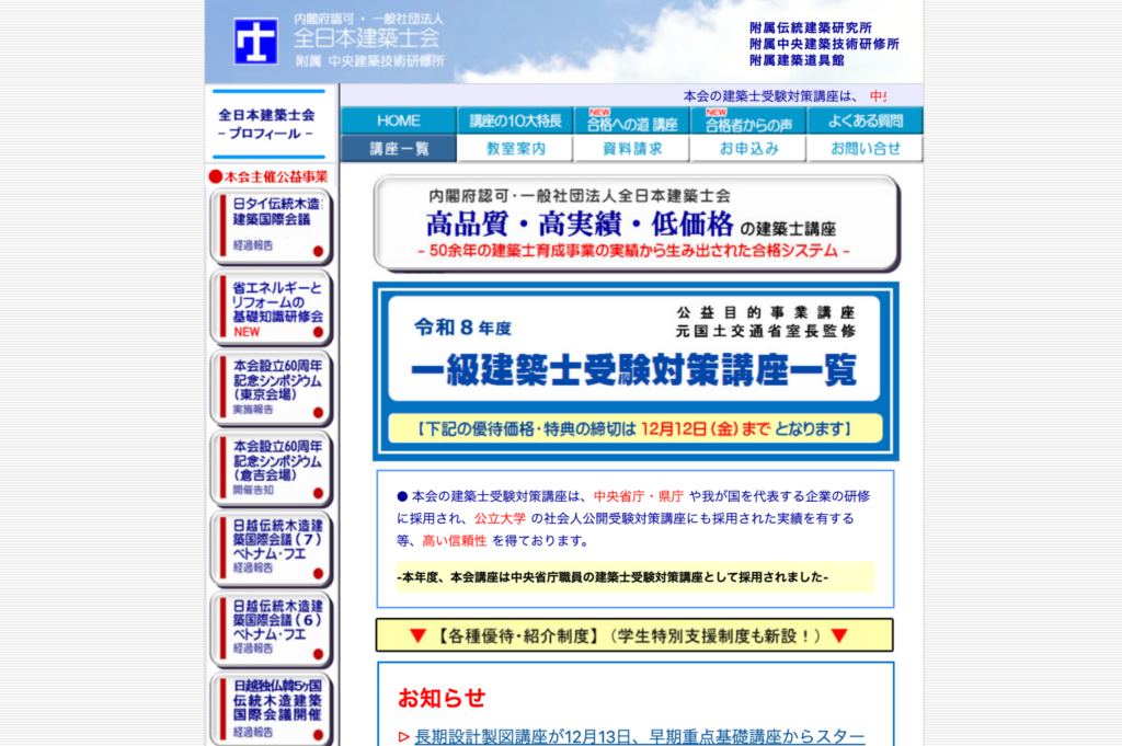 | 全日本建築士会 | ・総合コース:224,000円 | ・質問対応・添削あり ・教材内容・カリキュラム公開 ・製図対策の内容公開 | ・令和7年度 学科合格率:85.7% ・令和6年度 製図合格率:87.2% |