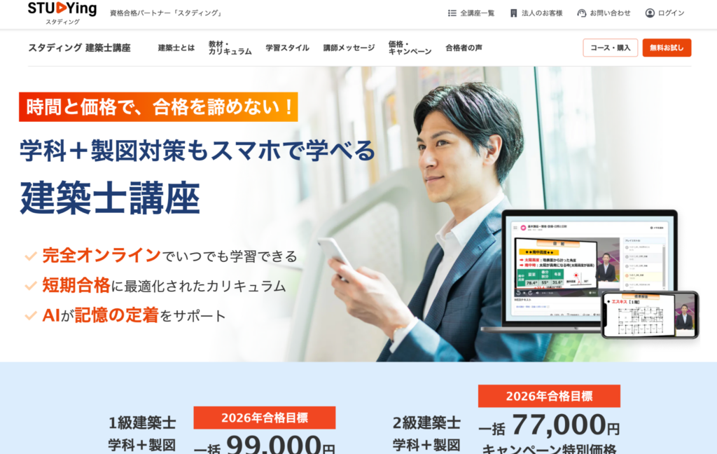 | スタディング | ・学科・製図総合:99,000円 ・学科対策:88,900円 | ・オンライン学習システム公開 ・学習画面デモあり ・製図対策の内容が公開 | ・合格者の声を掲載 |