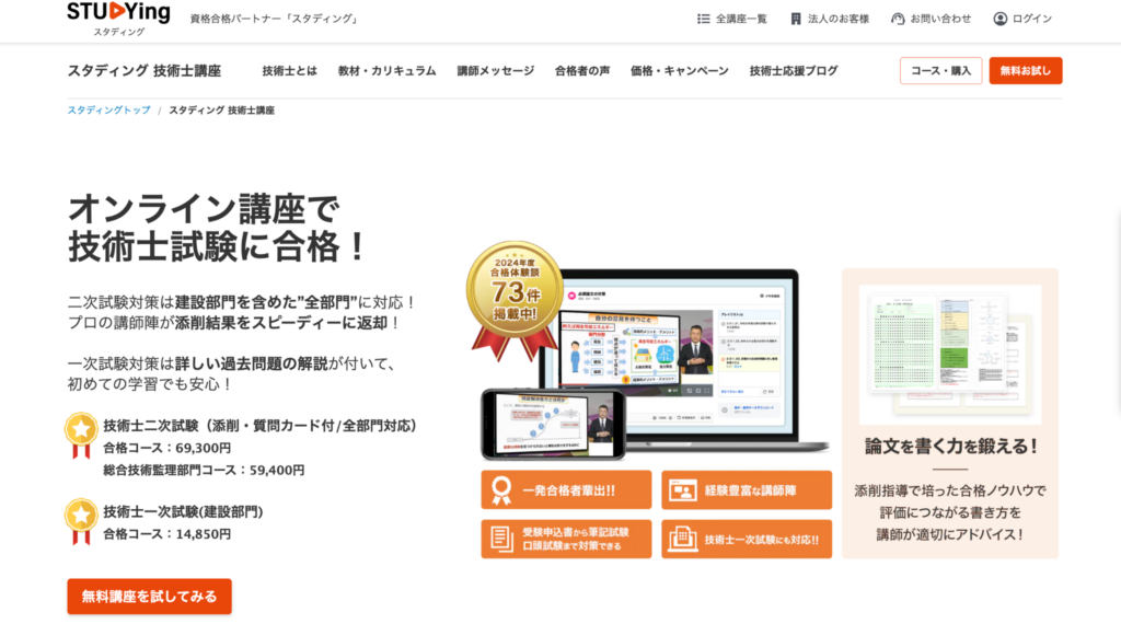 スタディングの技術士講座は、「一次試験向け(※主に建設部門)」「二次試験向け(論文対策を中心とした講座)」をオンラインで提供しており、学習を段階的につなげやすい構成になっています。