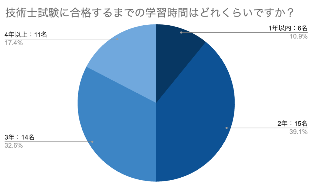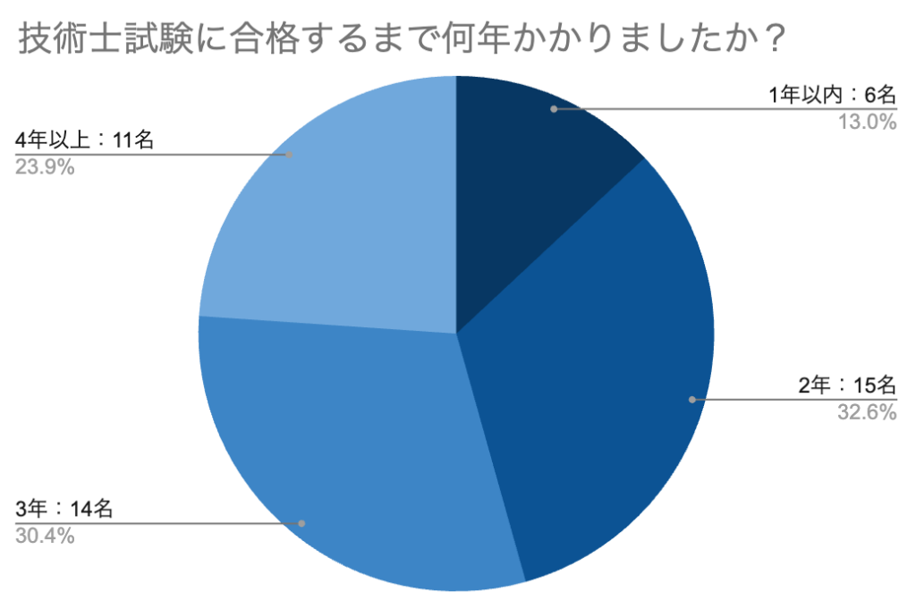 実際に技術士試験に合格した人に、「技術士試験に合格するまで何年かかりましたか?」とアンケートをとったところ、下記の結果になりました。