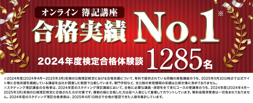 「スタディング」は、簿記講座を始めとする金融・不動産・士業・IT系資格を取り扱う通信講座です。「オンライン簿記講座合格実績No.1」を掲げる通り、毎年1,000人以上の合格者を輩出しています。