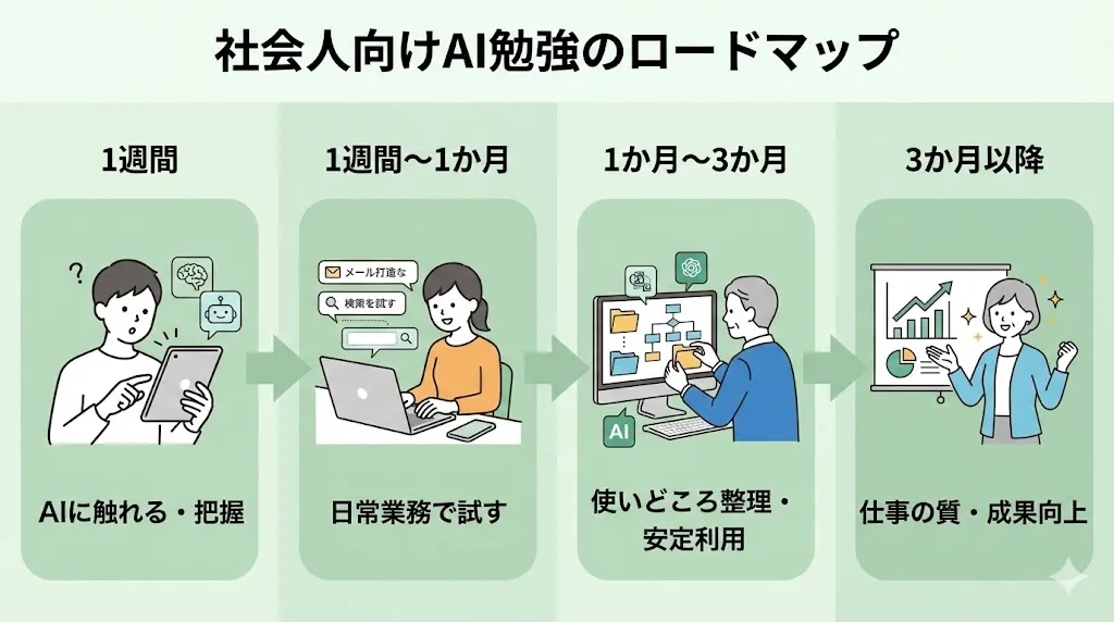 AIを使って仕事を効率化したい社会人の場合、勉強の目的は明確です。 知識を増やすことではなく、今やっている作業をどう変えられるかに直結する内容を優先する必要があります。