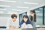 設計製図など建築・インテリア・環境デザインの専門知識と技術を身につけ、美しく、機能的であることはもちろん、時代によりそい、人にも環境にも社会にもやさしいデザインを創造・提案できる力を養います。「建築デザイン」「インテリアデザイン」「環境デザイン」の3領域を設定し、デザインに特化した学びが特長です。建築デザインに関する体系的な知識・技能の修得を図るために、基幹的な科目の多くを必修とし、すべての学生が国家資格の一級建築士試験受験資格の取得をめざします。また、コンピュテーショナルデザインやデジタルファブリケーションを学ぶ建築情報学分野を新たに加え、デジタル技術活用で生産性向上が求められている建築業界で活躍する人材を養成します。さらには、行政との協働で地域課題に取り組むなど実社会の建築に関わりながら、見えない問題を発見し答えを導く力を備え、社会の発展を支える力を育みます。